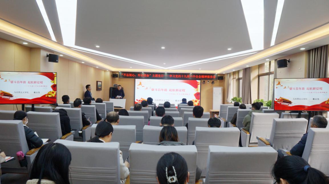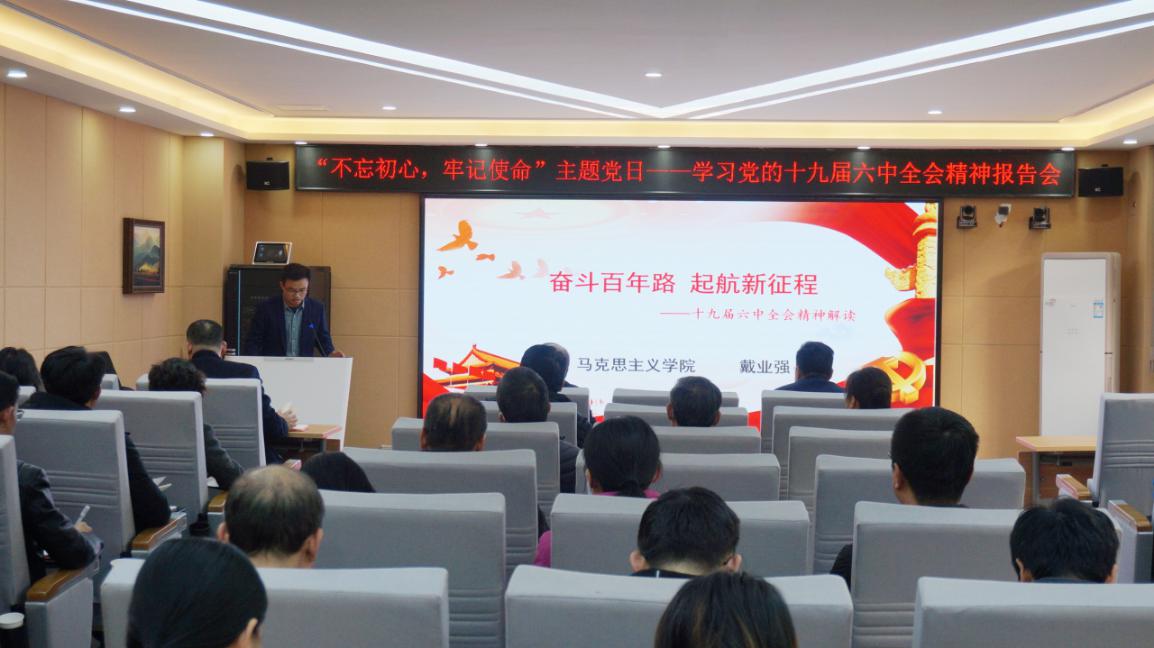 为推进党的十九届六中全会精神深入学习,12月14日国有资产管理处等机关六个党支部联合举办“不忘初心、牢记使命:学习党的十九届六中全会精神辅导报告”主题党日活动,邀请学校理论宣讲团成员、马克思主义学院副教授戴业强博士做学习党的十九届六中全会精神辅导报告。